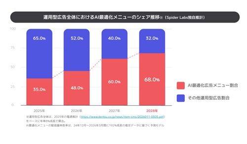 現在のデジタル広告市場において最も注視すべき変化は、配信構造のAI最適化への急激なシフトです。当社の独自試算によると、2028年には運用広告予算の約7割(推計2.5兆円)がAI最適化メニューに移行すると予測されています。