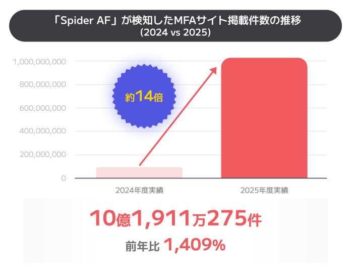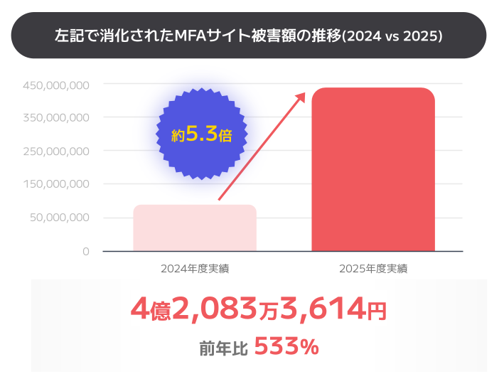 近年は生成AIを活用して粗悪なコンテンツを無数に量産する手口が横行しており、2025年のMFAサイトへの広告掲載件数は前年比1,409%(約10億1,911万件)、被害額は前年比533%(約4億2,083万円)と爆発的に拡大しました。