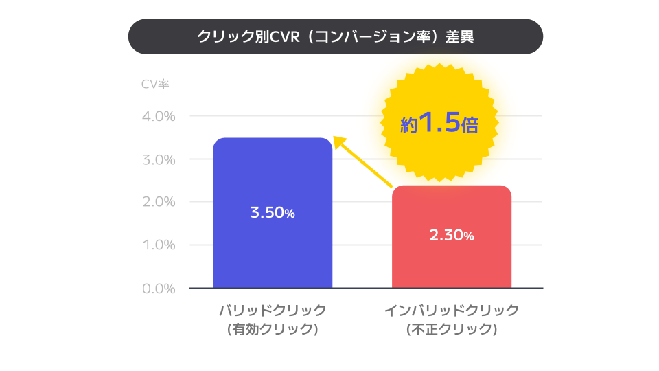 実測データにおいても、実際のユーザーによる正当なクリックである「バリッドクリック」のコンバージョン率は3.50%であり、ボット等による無効なクリックである「インバリッドクリック」の2.30%と比較して約1.5倍高いことが実証されています。