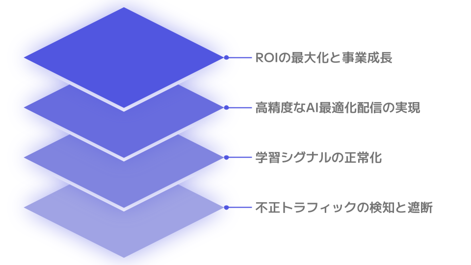 その具体的なアプローチとして、アドベリフィケーションツールを適切に導入・活用し、無効トラフィックを常時検知・遮断することが推奨されます。ノイズを自動的に排除する仕組みを持つことで、AIにクリーンなデータのみをフィードバックする「シグナル・マネジメント」が可能となります。